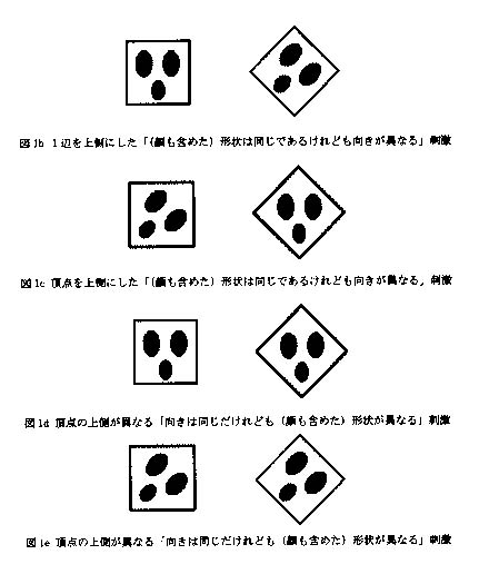 刺激・装置:まず,標準刺激として,ロックが実験に用いた正方形と菱形を用意する.これをもとにして,上下方向をあらかじめ定めておくために,標準刺激に顔を書き込んだ図1bのような図形を実験刺激として作成する.図1bの刺激は,正方形の1辺が上側となっているが,逆に菱形の頂点を上側にして作成した刺激が図1cであり,これらの図形は「(顔も含めた)形状は同じであるけれども向きが異なる」刺激群(以下,“向き”刺激群)であると言える.逆に,片方の図形の上側が辺,または頂点である刺激が図1d,1eであり,こちらは「向きは同じだけれども(顔も含めた)形状が異なる」刺激群(以下,“形状”刺激群)と言える.これらの5つの刺激を多数回,被験者に反復提示して,被験者が「同じ」か「異なる」かの2件判断を行うまでの平均時間を計測する.なお,時間の計測はコンピュータ上で行えば簡単であり,現実にそのためのプログラムは慶応の研究室に存在している.