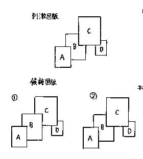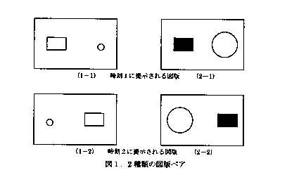 方法:用いる図形以外は,すべて先行実験と同じ方法で行う.装置には,仮現運動を起こすのに適切な時間間隔で点滅する点滅器,図版を用意する.図版は1枚につき2つの図形が提示されるもの(もう1枚これと左右逆のものがペアとなる)を2種類用いる.1つ目は,ロックらの提示した図形とまったく同じ大きさであるが,○だけでなく四角形にも中に色の付いていない図形のペア,2つ目はロックらの提示した図形と同様に四角形にだけ色が付いているが,○の直径を四角形より大きくした図形のペアを用意する.この刺激図版を,下に示す.